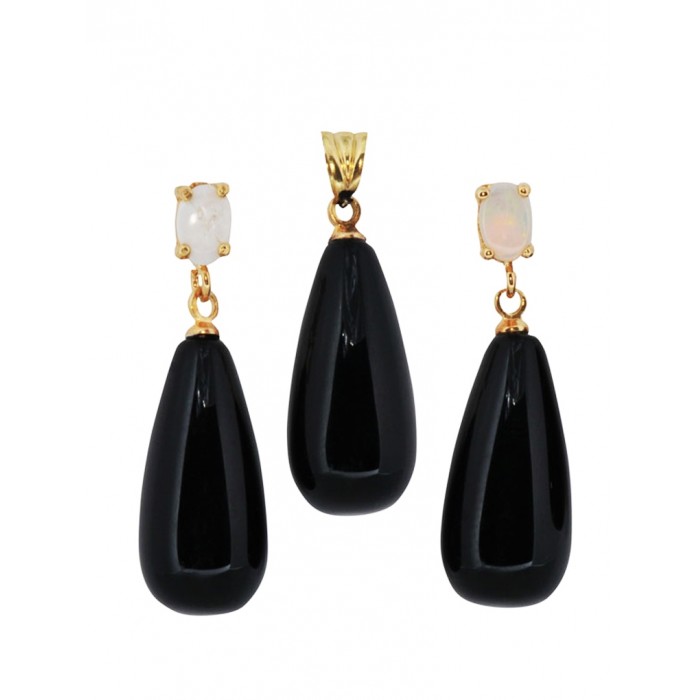 14 kt sari altin üzerinedir,8*16 mm onix drop tasi ve küpenin klips kisminda 4*6 mm oval avustralya opali mevcuttur.Set küpe ve kolye ucundan olusur.