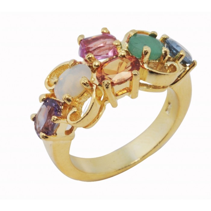 Sik bir tasarim yüzügüdür.yüzükte 6 adet 6*4 mm oval faset kesim tas bulunmaktadir.sirasi ile:mavi topaz,kök zümrüt,topaz,pembe kuvars ,opal,ve alexsandire(hydrotermal) taslari bulunur.